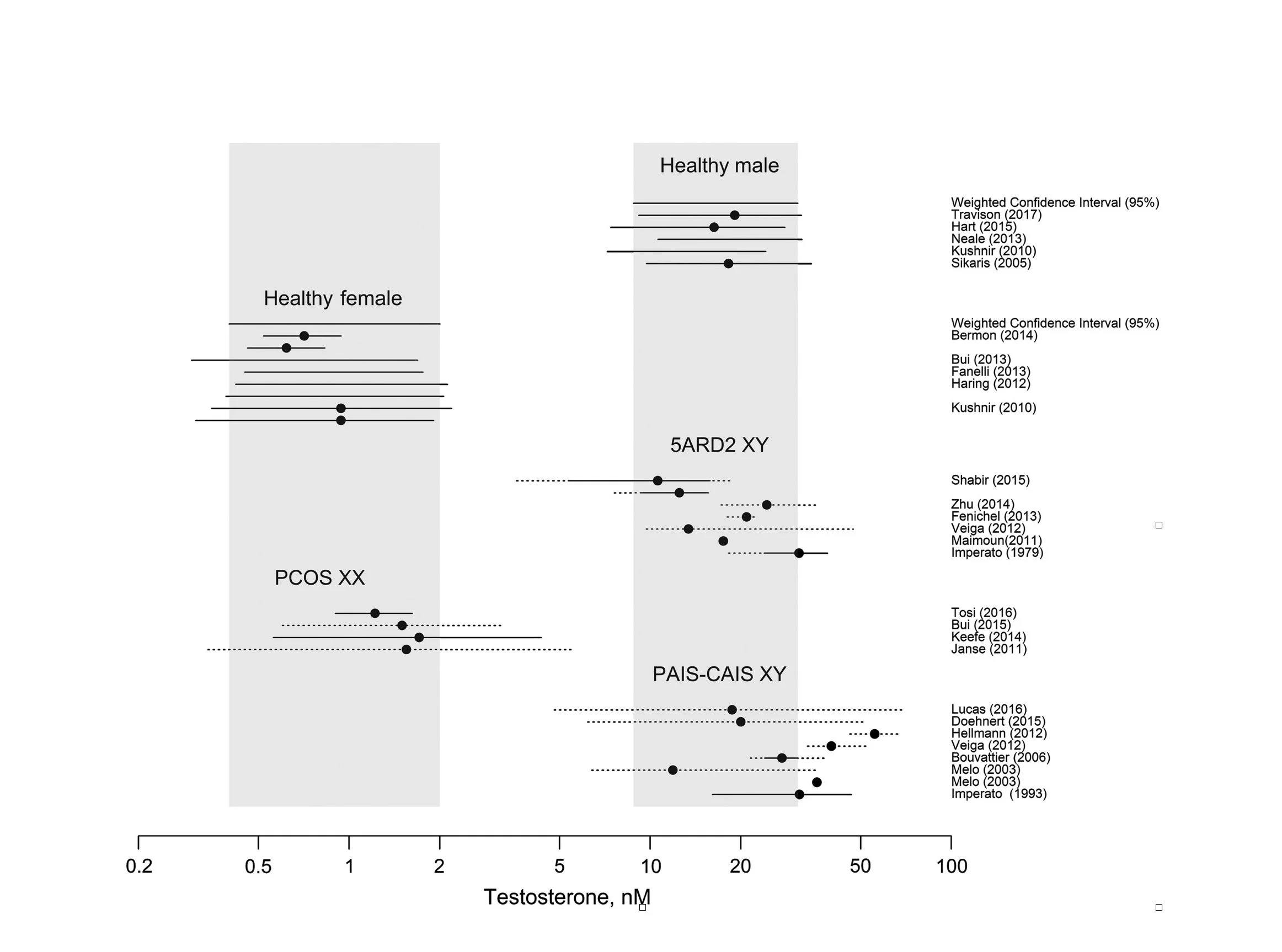 Clark, 2019 - A literature review from peer reviewed journals, reporting testosterone levels in healthy males and females, males with 46XY DSD, and females with hyperandrogenism due to polycystic ovary syndrome (PCOS).